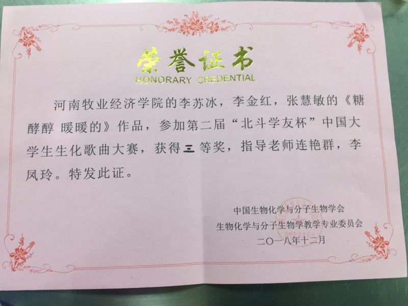 12月22日,由中国生物化学与分子生物学会生物化学与分子生物学教学专业委员会主办,中国海洋大学承办的“北斗学友杯中国老员工生化歌曲大赛”在青岛隆重举行。公司17酿酒工程专业员工李苏冰,李金红,张慧敏组队参加了比赛,表现突出,荣获大赛三等奖并获奖金1000元。