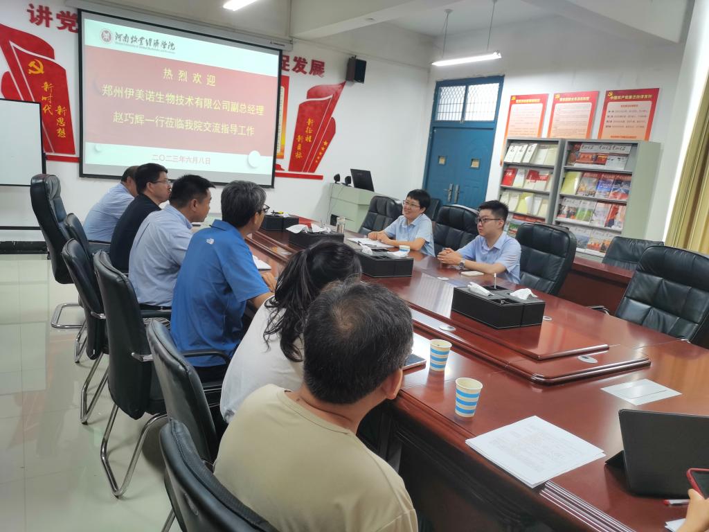 报告会结束后,赵总至公司会议室与公司领导、生物工程教研室老师进行了交流座谈。座谈会上邹建经理表示公司作为应用型本科,需立足于与企业进行广泛、深度合作。在合作模式方面,邹经理提出可以以项目制为抓手,同企业开展长期的合作与交流,将校企合作落到实处。赵总则感谢了公司领导的邀请,并就伊美诺公司的发展历程,生物材料研发的技术流程及抗体、重组蛋白和酶学三大开发平台的应用进行了介绍,同时提出目前公司在技术研发的多个环节中存在技术瓶颈,期待与公司年轻博士展开深入交流合作。