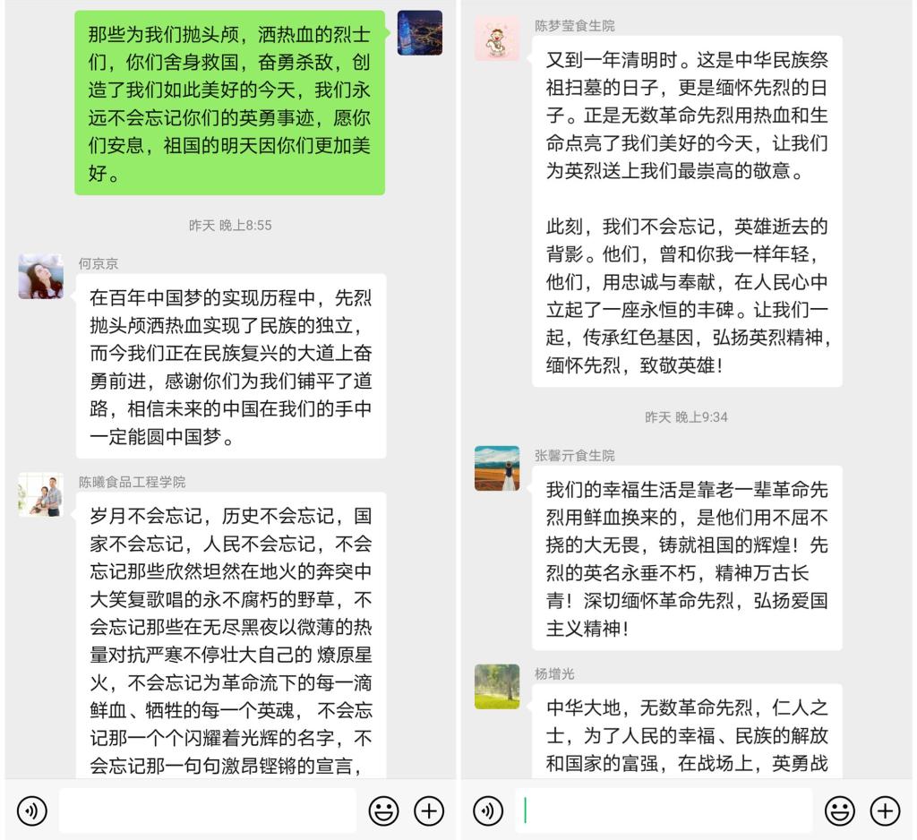 公司师生通过手机H5或中国文明网微信公众号进行网上献花,在微信群、QQ群进行祭英烈留言。何京京老师留言:我们要弘扬先烈的崇高精神,革命传统要牢牢记在心头,以此激励我们、警示我们,要珍惜革命先烈用鲜血和生命换来的今天社会安定祥和、经济持续增长、人民安居乐业的美好生活;20食安02田笑留言:我们要弘扬先烈的崇高精神,革命传统要牢牢记在心头,以此激励我们、警示我们,要珍惜革命先烈用鲜血和生命换来的今天社会安定祥和、经济持续增长、人民安居乐业的美好生活。