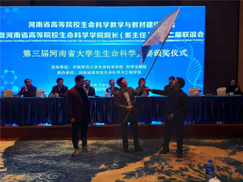 经过公司申请和组委会评审,2021年河南省生命科学竞赛决赛将在公司举行,在颁奖典礼上,邹建代表公司从组委会秘书长李卫国教授手中接过比赛会旗,并做了表态发言,在明年的比赛中做好东道主,保证圆满完成比赛任务,迎接兄弟院校的参赛。