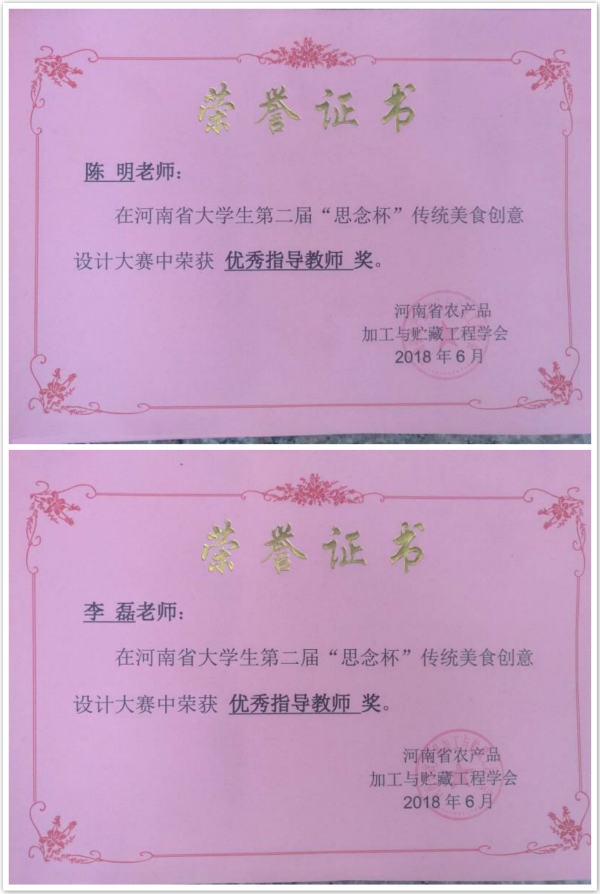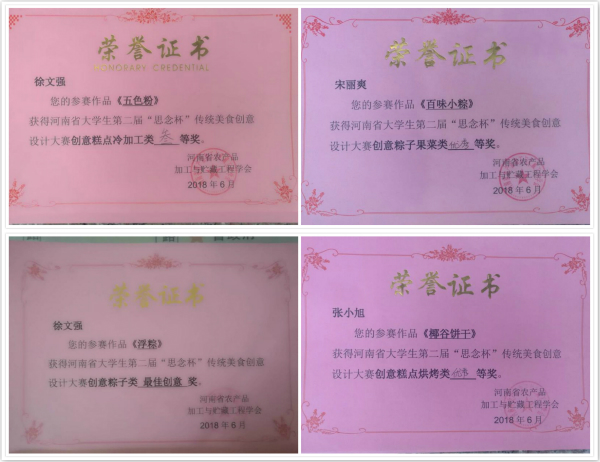 best365足球官网领导高度重视此次大赛,公司团总支精心组织,由公司陈明老师、李磊老师带队,指导2017级烹饪工艺与营养专业三名员工积极备战。其中,员工徐文强的作品“浮棕”以独特的“水晶+粽子的创意”获得了大赛一等奖和最佳创意奖,作品“五色粉”获得三等奖;员工宋丽爽的作品“百味小棕”和张小旭的“椰谷饼干”获得优秀奖;陈明老师和李磊老师获得优秀指导老师奖。