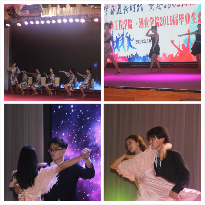 欢送会在歌舞《我们都是追梦人》中拉开序幕,活力四射的健美操舞者为晚会的进行营造了热烈的氛围;拉丁舞《almost lover》与华尔兹《红粉佳人》的完美融合,彰显了食生学子的青春魅力和精神风貌,毕业生倾情演唱的民谣串烧旋律悠扬,韵味悠长,饱含着对母校的眷恋;逗趣中带有一丝伤感的小品《我们毕业了》,展现了母校南门落成、图书馆启用、宿舍装上空调等日新月异的可喜变化,也表达了青春追梦人对师长的感恩之情及对未来的踌躇满志。李欣老师参演其中,鼓励毕业生们到基层、到企业、到西部、到祖国最需要的地方去,发挥自己的光和热,用专业所长,造福社会;国风歌曲与汉服走秀完美融合的节目——《华夏有衣之兰亭序》,伴着古筝和琵琶的演奏,体现了新时代老员工对中国传统文化的传承与弘扬,华夏儿女的文化自信贯穿始终;曾荣获东南地区亚军的街舞《BonBonChocolate》,释放了热情奔放的青春气息,舞者借舞蹈张扬青春个性,表达自我,将晚会的气氛推向了高潮;歌曲《不说再见》缓缓诉说了离别之际的不舍,毕业有期,梦想无尽;由十余位毕业生代表表演的集体舞《人猿泰山》通俗诙谐,燃爆全场,晚会师生的欢笑中落下帷幕,所有的不舍、感激、祝福、憧憬和期盼都被定格在照相机快门声响起的瞬间。