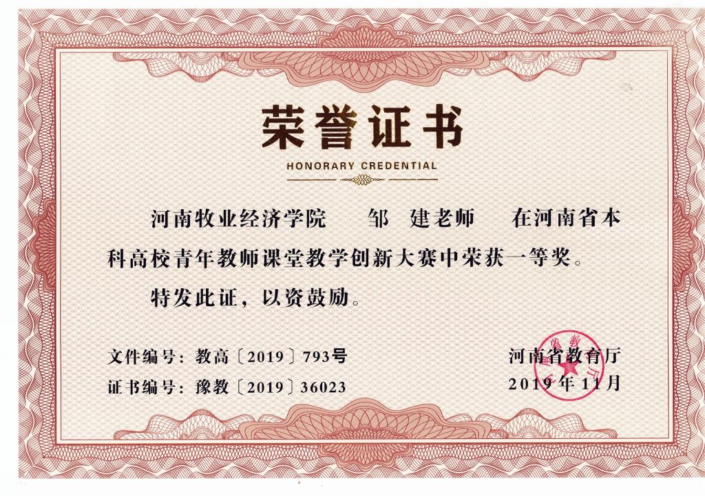 日前,从河南省教育厅下发的《关于公布2019年河南省本科高校青年教师课堂教学创新大赛获奖名单的通知》(教高〔2019〕793号)获悉,公司选派的3位参赛教师,经省级复赛、省级决赛激烈角逐,获得奖励受到表彰。其中,best365足球官网邹建老师荣获一等奖。