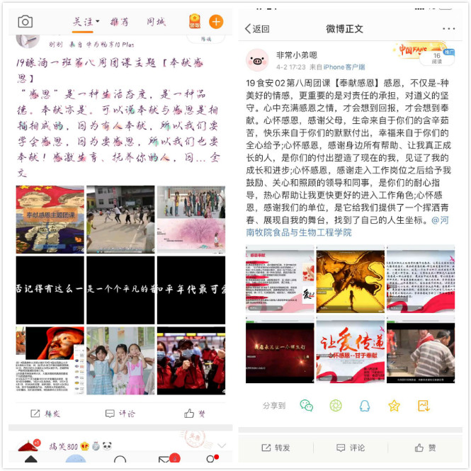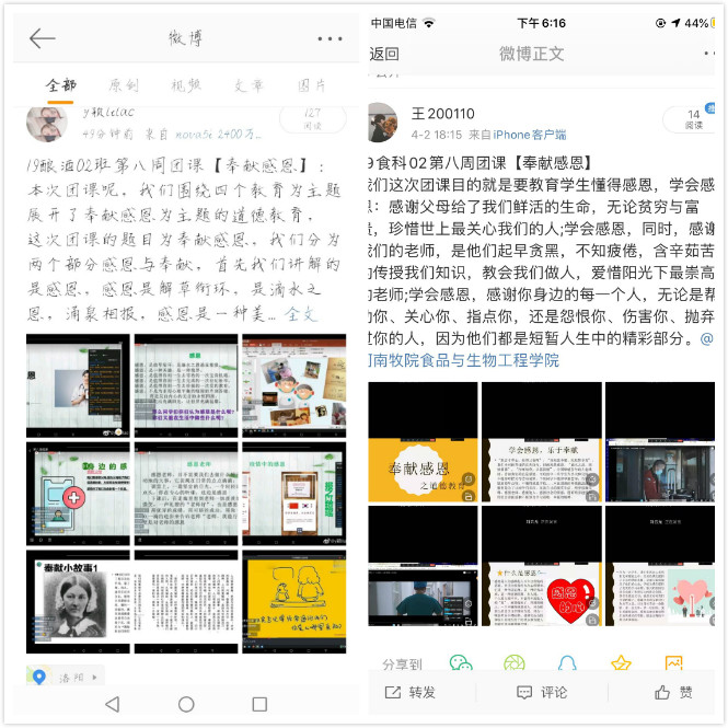 本次团课紧紧围绕“奉献”和“感恩”两个主题词展开进行。团课过程中,各班团支书带领同学们深入学习在新冠肺炎疫情中从国家到地方政府再到个人的团结奋进和无私奉献精神。19酿酒01班主持人说:“奉献,是成功的不二法则。只有奋斗者的人生才称得上是幸福的人生。此次疫情正是各行各业、千千万万个坚守在抗疫一线的奋斗者和逆行者,他们勇于担当、甘于奉献,只有聚涓滴之力,才能守护山河无恙”。接着,19生物02班主持人为同学们播放《战疫情,感谢你——逆行者》、《看林君德院士的最后一刻》等视频,让同学们深入了解全国上下面对新型冠状的勇往直前,无私奉献的精神与品质。留言区纷纷发表言论和看法:“感恩他们为祖国所做的一切!”、“感恩每一位‘不曾谋面’的医护人员、警卫工作者、社区服务人员、环卫个人和外卖小哥等等,没有他们的负重前行,就等不来如今的春暖花开。”无畏、无私、无悔,大仁、大勇、大爱,读懂了没有硝烟的战场上的英勇牺牲和无私奉献,才能读懂何为‘家国情怀’,何为‘奉献感恩’。”同学们纷纷表示:“要心存感恩之心,做暖心之事,在服务中奉献、在奉献中成长,让青春在奋斗和奉献中绽放出最闪耀的光彩。”