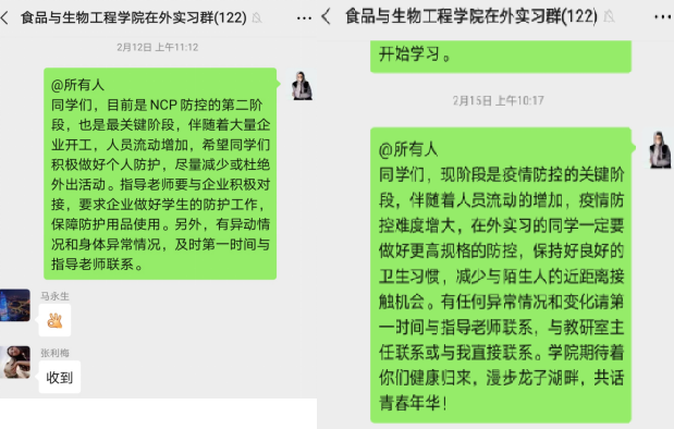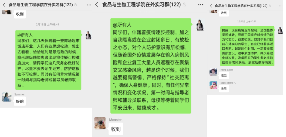 疫情发生后,公司第一时间统计在外实习员工状态,包括实习人数、分布区域、实习企业防护情况、员工身体状态及精神状态,并于2020年1月28日迅速组建微信群,采取实习指导教师和班主任双线管理,在做好实习指导的同时,将实习管理重心转移到员工健康防护上,尤其是对于在外地实习的员工,经常性发布疫情防护知识、注意事项等,对疫情相对严重和人员流动大的城市实习的员工,有针对性的重点指导。