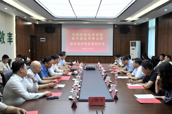 罗士喜董事长在致辞中说,best365足球官网积极响应省委、省政府“豫酒振兴”号召,主动服务河南经济社会发展需要,在全省高校率先成立酒业公司,为豫酒发展提供人才和智力支撑。几年来在省白酒业转型发展专项工作领导小组的大力支持下,发挥自身优势,积极培养酿酒行业高质量应用型人才,强化科技服务与产教融合,为豫酒振兴作出了应有的贡献。他指出,本次与宝丰酒业技术合作项目签约,仅仅是一个开始,牧业经济公司将竭尽全力把合作项目做好,后续双方还将在文化、生产、营销等方面开展合作,力争通过双方共同努力,再创宝丰酒业新辉煌。他还深情寄语宝丰酒业从牧业经济公司招聘入职的五位优毕业生:要珍惜机会,扎根酒业,坚守初心,刻苦学习,努力向大师之路迈进,不辜负公司和老师的期望!