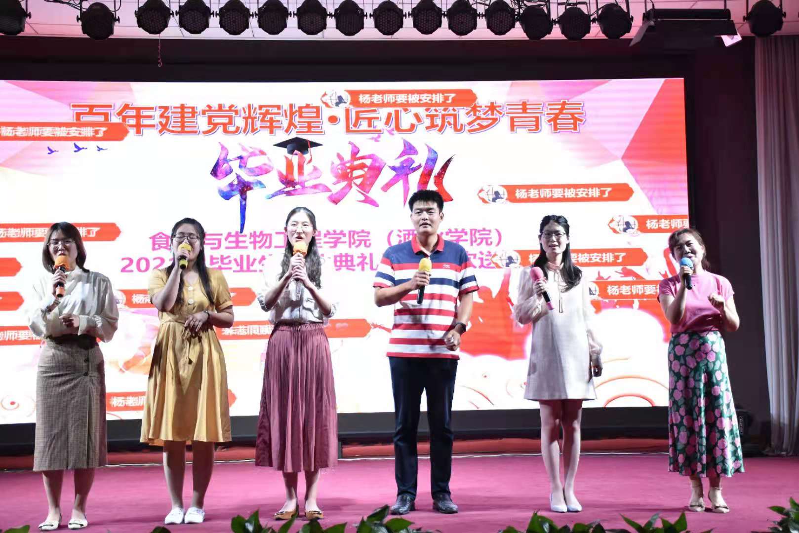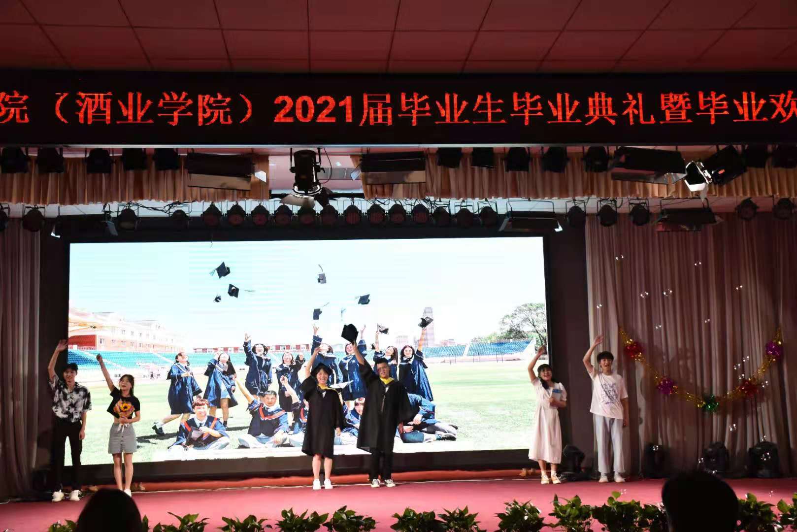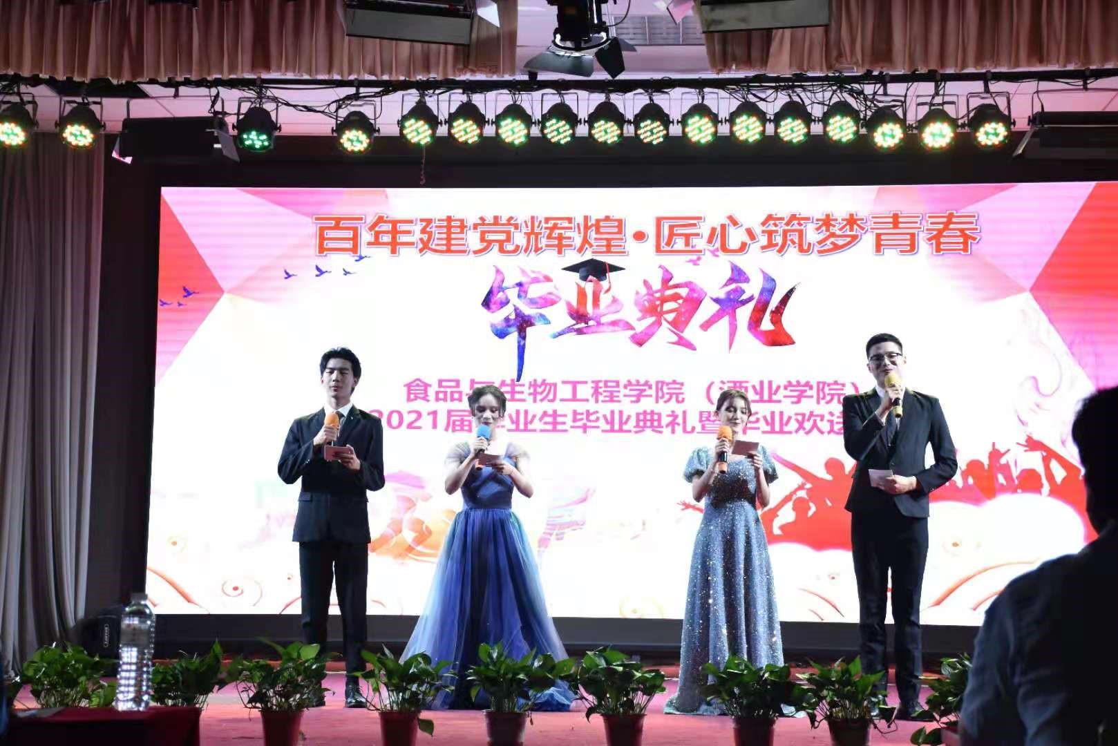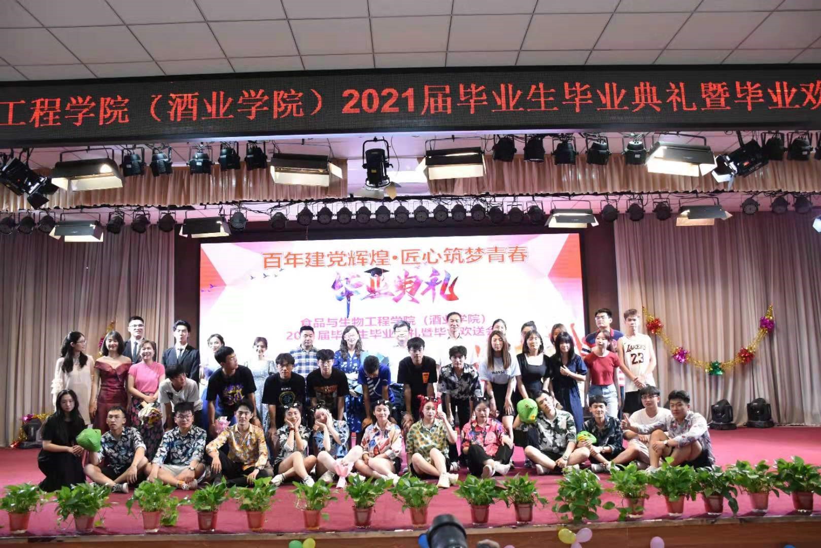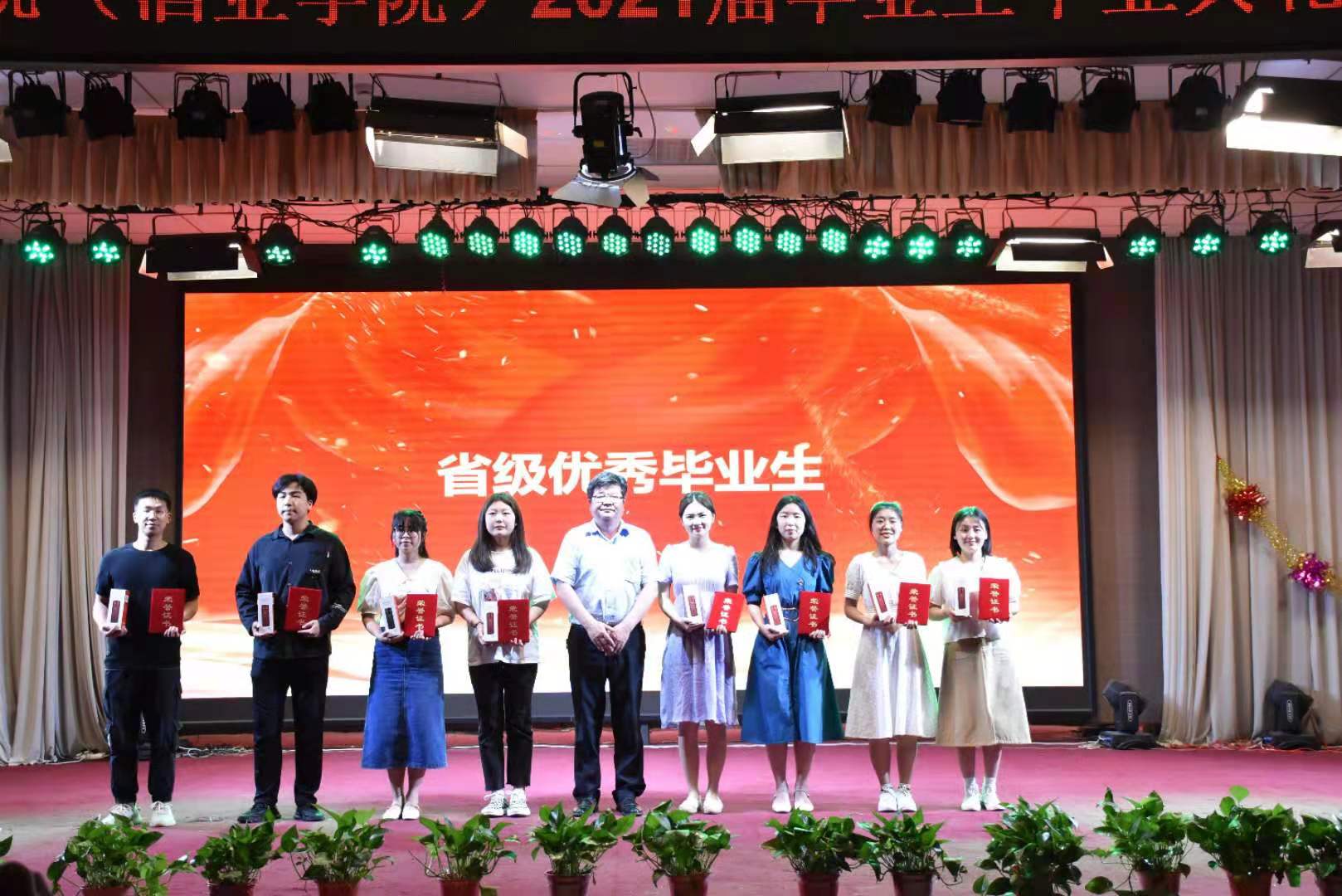 典礼在校现代舞团优美的舞蹈中拉开序幕。公司党委书记赵安勇为毕业生们送上祝福,表达母校及老师对毕业学子们的殷切希望。紧接着,陈云飞等员工演唱歌曲《一生有你》,带来欢声笑语,副经理岳晓禹和高雪琴老师演唱《阳光总在风雨后》送给毕业生。之后,院领导们为省级优秀毕业生代表和校级优秀毕业生代表们颁奖并合影留念。邹健老师演唱的《再回首》让气氛达到高潮。院礼仪队精心准备的情景剧、王鑫、仲威宇等同学深情朗诵的《这个六月》将青春年华的朝气蓬勃展现的淋漓尽致。紧随其后的是院领导为毕业生代表颁发毕业证书及纪念品、拨苏正冠。17级团学委们献上歌舞《韭菜花儿开》,为自己的老员工涯画上完美的句号。晚会在院团委辅导员合唱的《再见》中圆满落幕。