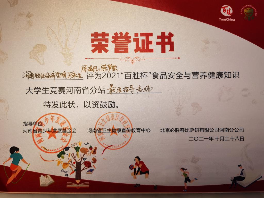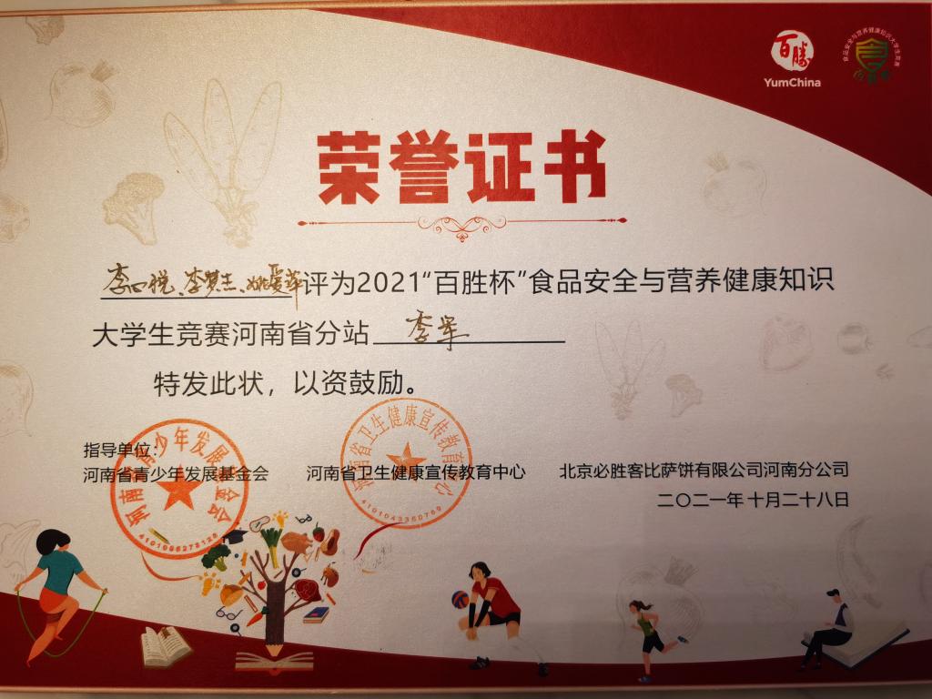 10月28日2021年“百胜杯”食品安全与营养健康知识竞赛河南分赛站决赛在郑州进行,来自郑州大学、河南工业大学、河南农业大学、best365足球官网四支代表队同台竞争,公司“食代”青年战队由公司李心悦、李梦杰、姚爱萍3名同学组成。经过激烈的角逐,best365足球官网荣获优秀组织单位奖,公司战队获季军。