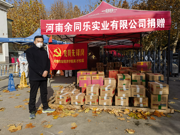 河南余同乐实业有限公司董事长余冠军听闻公司英才校区疫情后,第一时间联系公司,捐赠70箱预制豆制素食,并连夜从开封协调车辆运送公司英才校区。