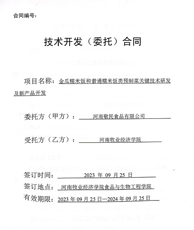 近日,公司预制菜团队与河南敬民食品有限公司签订“金瓜糯米饭和普通糯米饭类预制菜关键技术研发及新产品开发”横向项目,本项目由团队成员张振辉博士主持,相关项目经费目前已到账。