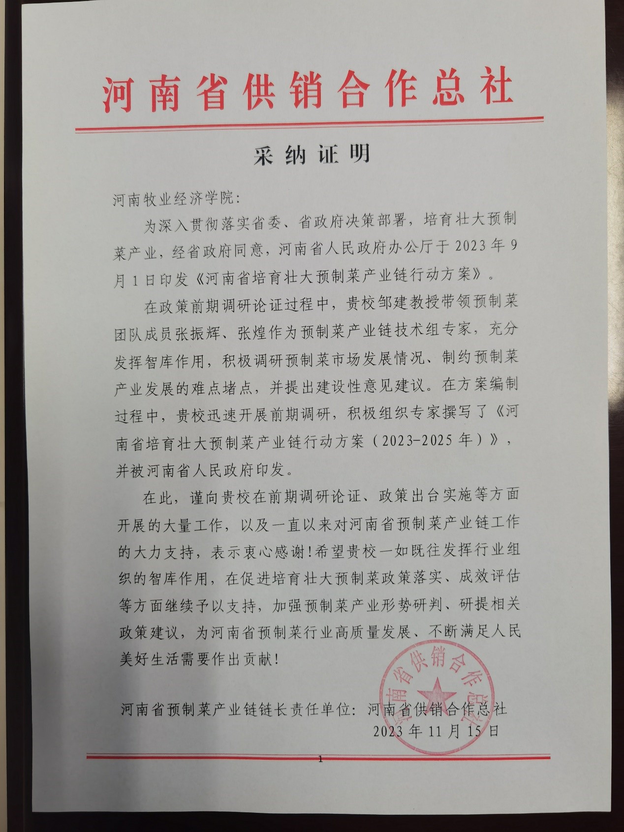 为贯彻党的二十大精神和习近平总书记视察河南重要讲话重要指示,锚定“两个确保”、实施“十大战略”,2023年河南省委、省政府将预制菜产业链作为重点产业链进行培育壮大,构建河南现代食品产业竞争优势。2023年5月,河南省人民政府启动预制菜产业链三年行动方案编制工作,公司作为预制菜产业链技术组牵头单位,充分发挥智库作用,积极开展调研、讨论,并组织专撰写了《河南省培育壮大预制菜产业链行动方案(2023-2025)》,《行动方案》明确了预制菜产业链总体思路、发展目标、战略布局、主攻方向、重点任务、推进措施等,获得了省政协、省工信厅和省供销合作总社的高度认可。