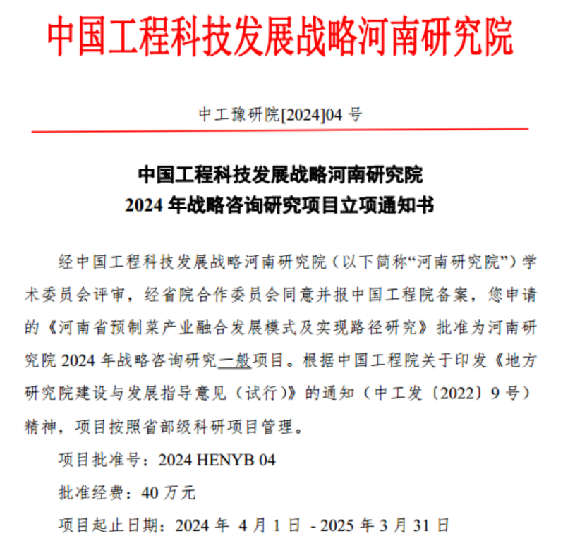 由中国工程院朱蓓薇院士领衔,公司best365足球官网邹建教授团队申报的中国工程科技发展战略河南研究院战略咨询研究项目“河南省预制菜产业融合发展模式及实现路径研究”成功获批,这是继公司作为河南省预制菜产业链技术支撑单位、撰写河南省培育壮大预制菜产业链行动方案并被省政府采纳发布,受聘信阳市预制菜产业发展顾问撰写“信阳预制菜高质量发展三二一工程”,指导新乡市原阳县、长垣市、洛阳市汝阳县、郑州市惠济区等地预制菜产业发展等一系列成果后,再次获批此项目标志着公司预制菜学科研团队围绕省委预制菜产业链战略需求开展有组织科研取得的又一硕果。