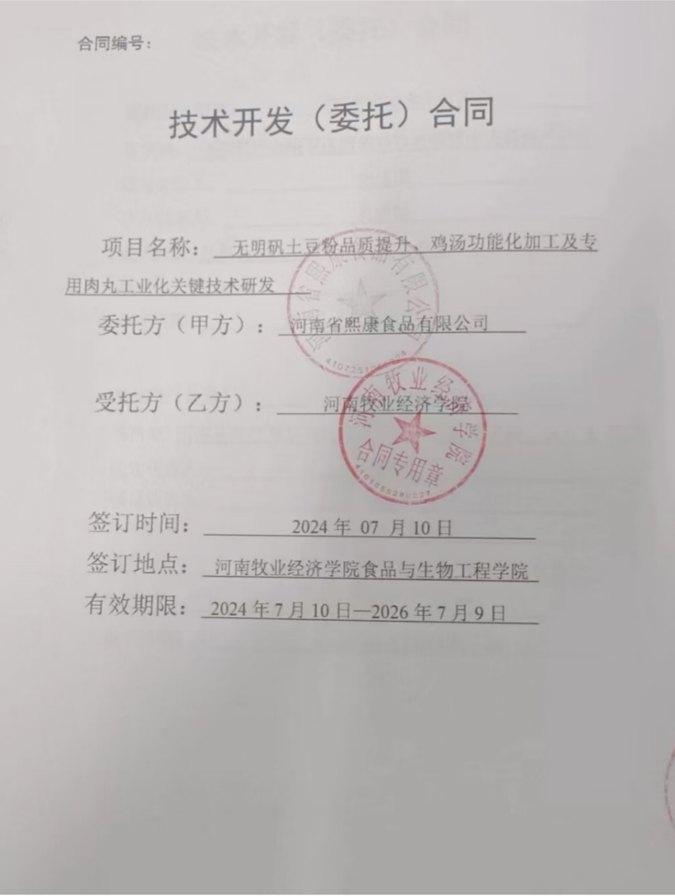 近日,公司预制菜团队在公司科研处指导下,与河南省熙康食品有限公司签订“无明矾土豆粉品质提升、鸡汤功能化加工及专用肉丸工业化关键技术研发”横向项目,本项目由预制菜团队成员许美娟博士主持,项目经费共计20万元。