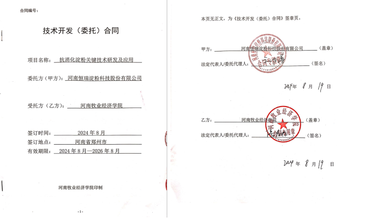 近日,公司预制菜团队在公司科研处指导下,与河南恒瑞淀粉科技股份有限公司签订“抗消化淀粉关键技术研发及应用”横向项目,本项目由预制菜团队成员侯银臣博士主持,项目经费共计15万元,一次到账。