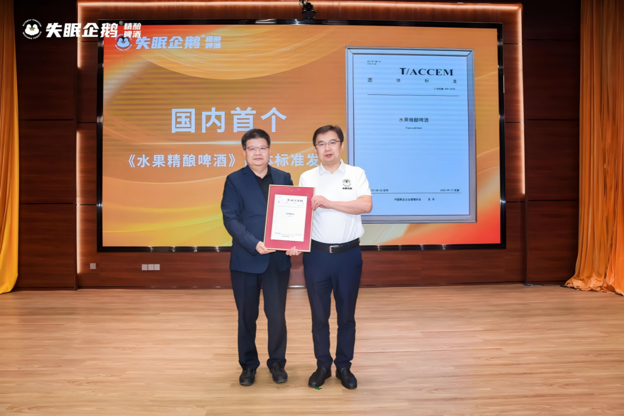 best365足球官网党委书记赵安勇高度赞扬了失眠企鹅水果精酿团队能够获得水果精酿全国销量第一,并获得国际权威机构沙利文认证以及水果精酿团体标准,会上为失眠企鹅创始人、公司食品专业优秀员工刘元昌颁发国内首个《水果精酿啤酒团体标准》,这标志着水果精酿品类步入规范化发展新阶段。