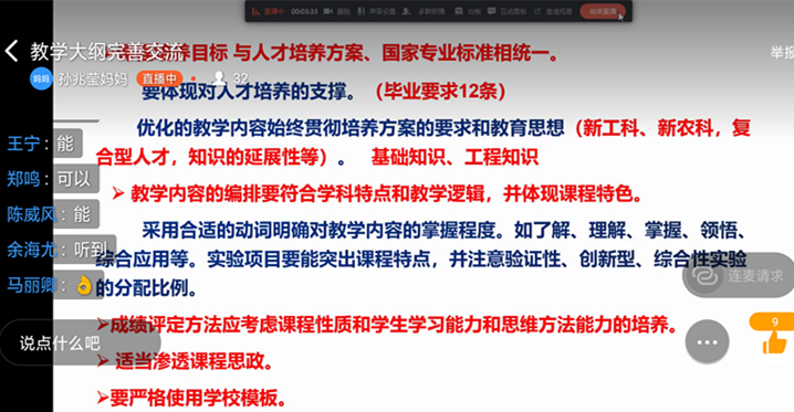 为进一步规范教学大纲的整改完善,依据《best365足球官网教学大纲管理办法》和《best365足球官网教案编写指导意见》,结合最新公司要求精神,best365足球官网于4月25日上午9点以钉钉直播的形式召开了课程教学大纲修订完善交流会,公司教学领导、食科、食安、酿酒、生工、生化、微生物、烹调七个教研室的教研室主任、各课程组负责人,部分任课老师均参加了钉钉直播交流会。