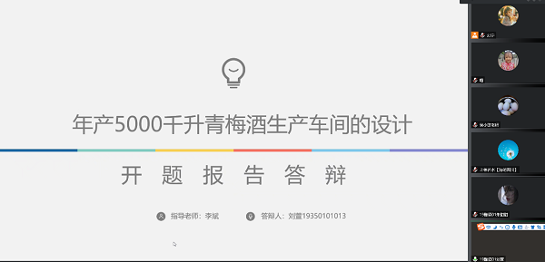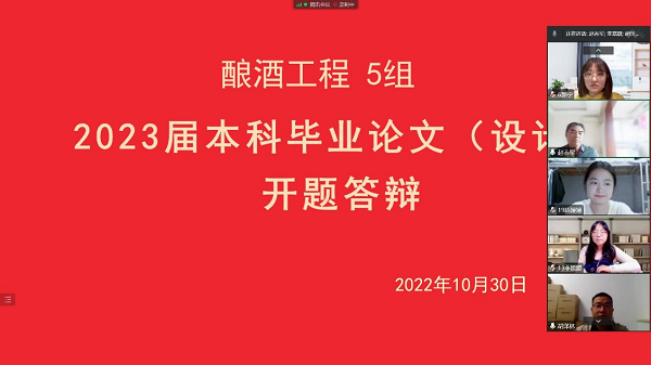 2022年10月30日,我院酿酒工程专业2023届毕业论文(设计)开题答辩以在线形式顺利完成。酿酒工程专业2023届毕业生共计121人,分为5组,每个小组24~25名员工进行开题答辩。公司副经理(主持工作)邹建教授巡视并参与了开题答辩全过程。