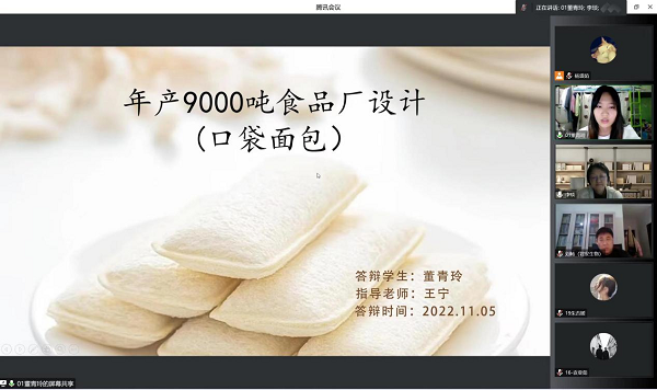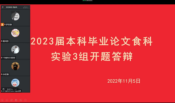 2022年11月5日,公司食品科学与工程专业2023届毕业论文(设计)开题答辩以线上的形式顺利完成。食品科学与工程专业2023届毕业生共计150人,分为7组,其中实验3组,设计4组。公司副经理(主持工作)邹建教授巡视并参与了开题答辩全过程。