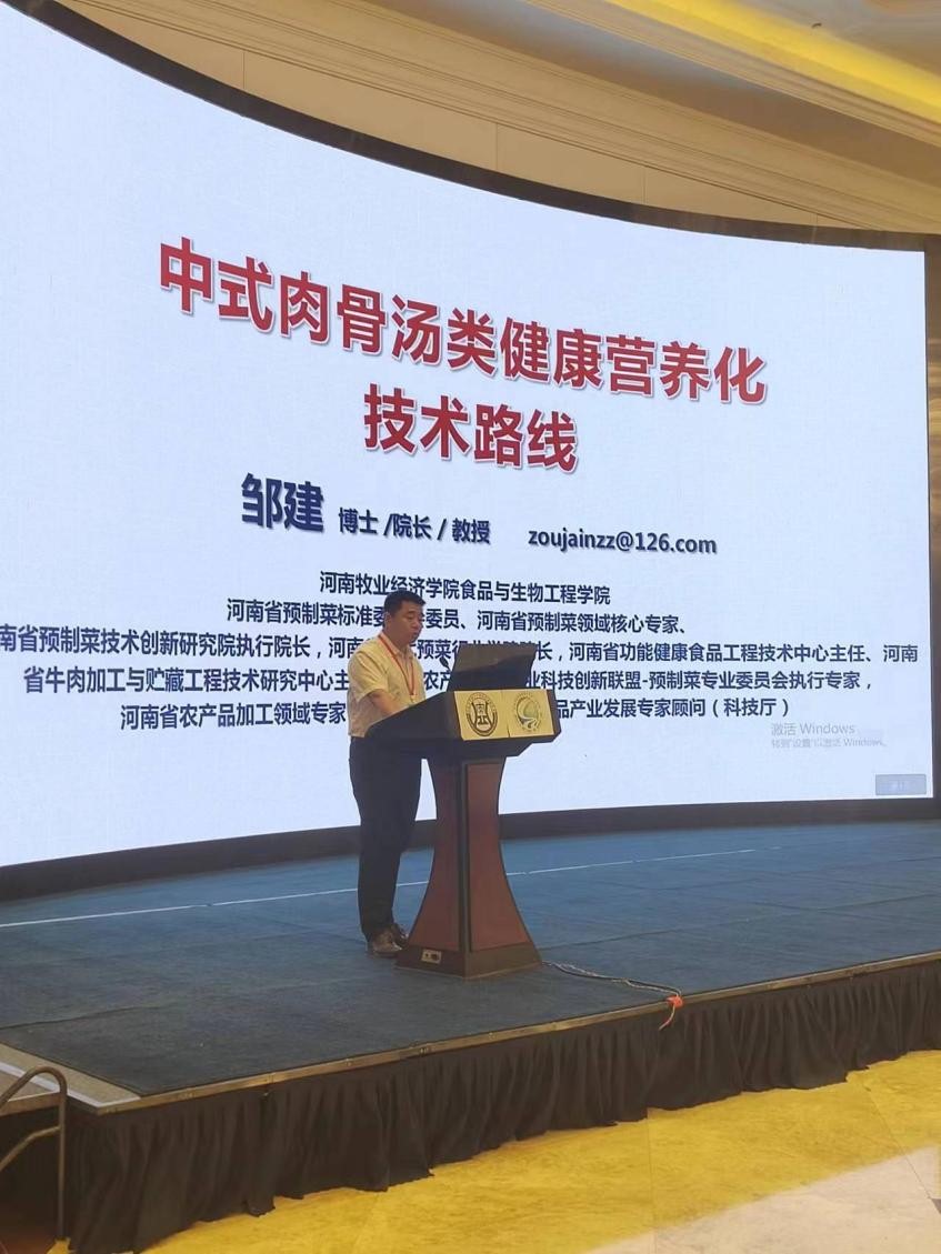 开幕式上,董事长罗士喜教授首先对与会的专家代表表示亲切的慰问和热烈的欢迎,接着介绍了公司的发展历史、办学特色、公司对河南省畜牧业做出的贡献及公司在预制菜产业的影响力和相关成果,并向参会的专家发出诚挚邀请,希望双方加强合作,共赢未来。在此次论坛期间,经理邹建教授受邀作了题为《中式肉骨汤类健康营养化技术路线》的学术报告,他从工艺、品质、营养、产业等多个角度对中式肉骨汤的加工生产进行详细阐述,并对中国预制菜产业的现状和发展前景进行了深入剖析。与会期间,公司肉品团队成员和青年博士们就肉制品加工、产品保藏、营养与品质、校企合作与参会专家、学者进行了深入的交流和探讨。通过本次会议和交流,展现了公司教师的科研水平,拓展了公司青年教师对肉制品领域重大问题和行业现状的视野,提升了对行业先进技术及高水平科研成果的认识,为进一步的校企合作、课程建设、学术提升、专业发展奠定了良好的基础。