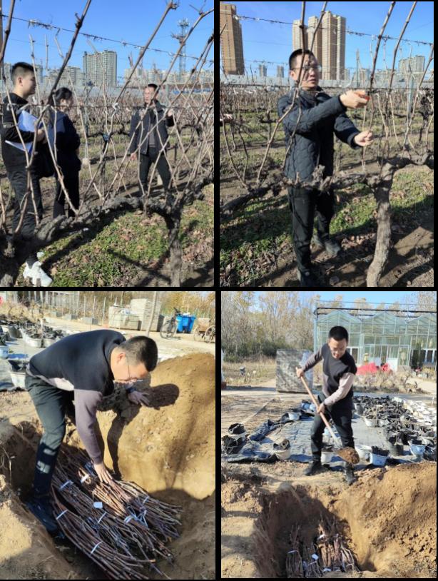 2023年12月初,依照《科研成果3年期转化方案》设计,陈博士带领课题组同学们赴郑州果树所葡萄国家资源圃开展优选红色酿酒葡萄品种冬剪枝条采集工作,返校后将枝条埋土防寒,明春繁殖育苗并栽培至河南天明民权葡萄酒有限公司实验田。