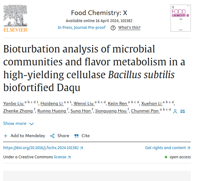 2024年4月16日,公司酿酒团队师生在国际知名学术期刊《Food Chemistry: X》(中科院1区期刊,IF:6.1)上发表了题为“Bioturbation analysis of microbial communities and flavor metabolism in a high-yielding cellulase Bacillus subtilis biofortified Daqu”的研究论文。刘延波副教授和联合培养硕士研究生李海登为共同第一作者,潘春梅教授为通讯作者,公司为第一署名单位和通讯单位,该研究得到河南省重点研发专项(河南白酒生态酿造关键技术研发与示范应用)和食品科学与工程校级重点学科项目资助。