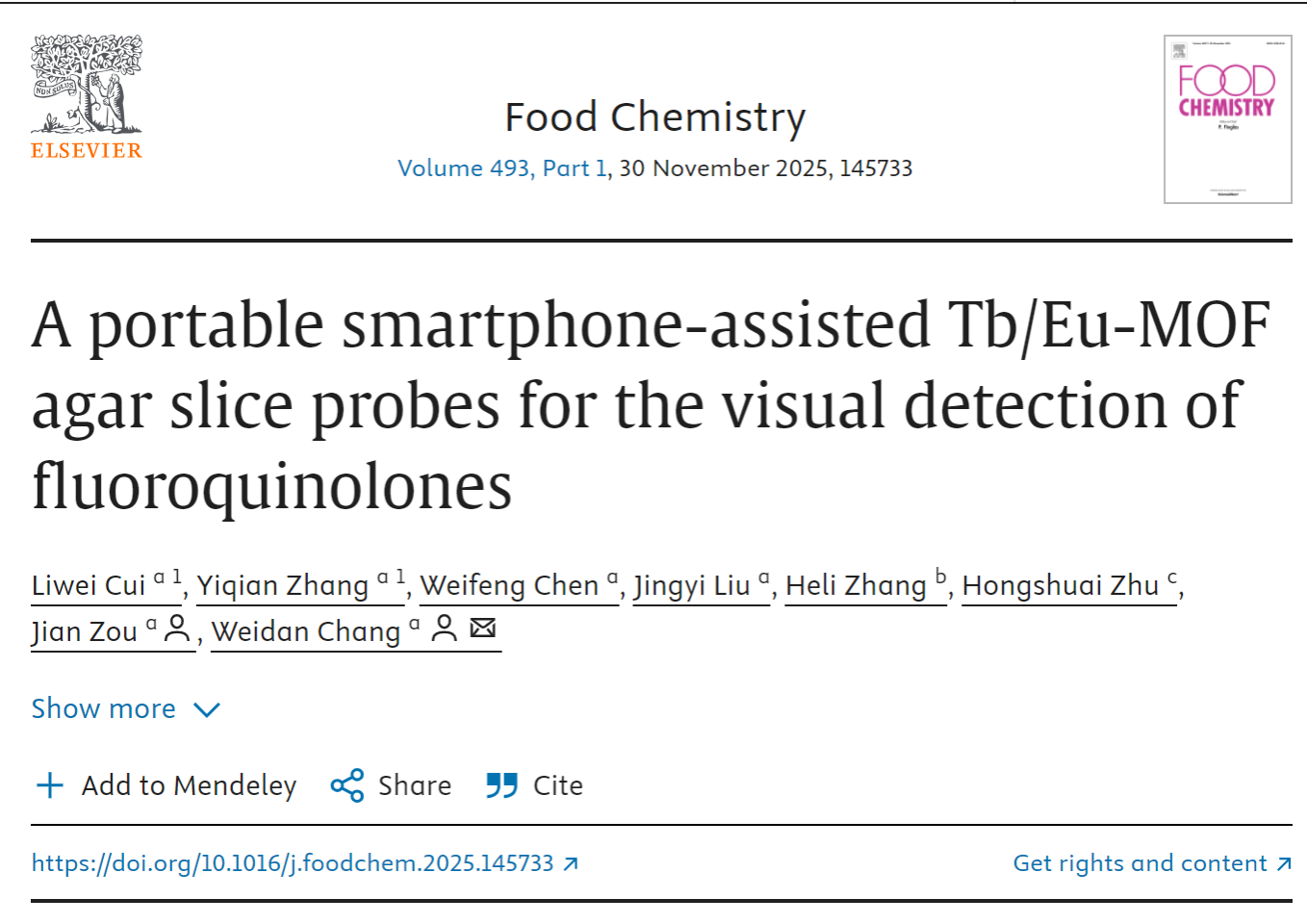 近日,食品与生物工程公司崔丽伟在国际顶级学术期刊《Food Chemistry》(中科院1区TOP期刊,IF:9.8)上发表了题为“A portable smartphone-assisted Tb/Eu-MOF agar slice probes for the visual detection of fluoroquinolones”的研究论文。该成果公司为第一署名单位和通讯单位,崔丽伟和20食安01员工张怡倩为共同第一作者,best365足球官网经理邹建、常惟丹博士为通讯作者。这是best365足球官网食品安全快速检测团队在国际重要影响力期刊上发表高水平论文的一次重大突破。