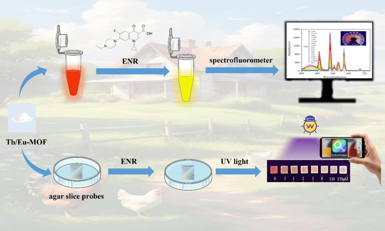 该研究成功开发出一种基于铽/铕双金属有机框架(Tb/Eu-MOF)的新型荧光传感平台,为食品中氟喹诺酮类抗生素的快速、可视化检测提供了创新性解决方案。研究团队通过精准调控金属离子比例,成功构建了具有双发射特性的Tb/Eu-MOF(3:1)纳米材料。该材料在遇到恩诺沙星抗生素时,可通过荧光共振能量转移效应发生明显的荧光颜色变化,从橙红色逐渐变为淡黄色,实现了检测结果的肉眼直观判别。团队进一步将纳米材料与琼脂糖结合制成便携式凝胶传感片,并借助手机色彩识别软件Color Picker进行RGB分析,使普通智能手机成为检测工具,现场检测可在5分钟内完成,检测限达4.7μM。这一研究成果解决了传统检测方法设备昂贵、操作复杂、难以现场应用的痛点,为养殖场、市场监管部门及家庭消费者提供了便捷高效的检测工具,对保障食品安全具有重要现实意义。