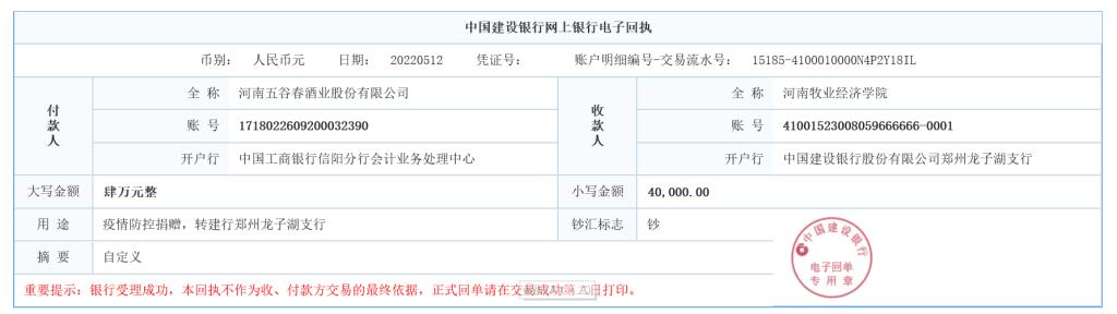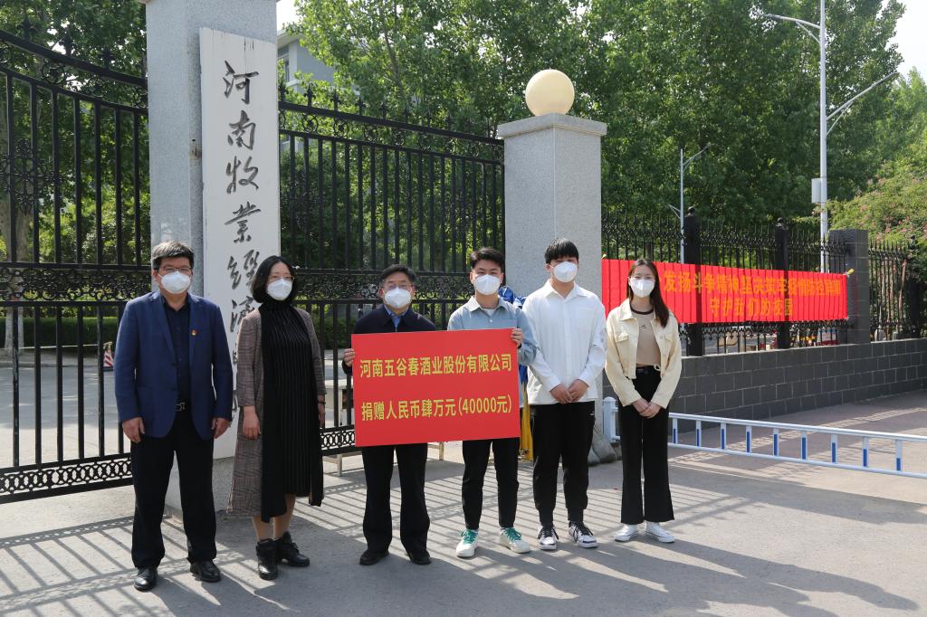 河南五谷春酒业股份有限公司成立于2014年7月,其前身为河南淮滨乌龙酒业有限责任公司,始建于上世纪50年代初期,宜宾五粮液股份有限公司控股子公司。公司位于河南省信阳市淮滨县产业聚集区,公司现已发展成为河南省白酒行业“五朵金花”企业、豫酒品质标杆企业。公司与河南五谷春酒业股份有限公司有长期良好合作关系,作为公司重要的校企合作伙伴,未来校企双方将密切合作、共同科研,资源共享、互惠双赢,提升技术水平、助力豫酒振兴。坚信在公司党委的统一领导下,社会各界的大力支持下,全校上下万众一心,众志成城,齐心协力打赢新冠疫情防控这场硬仗!