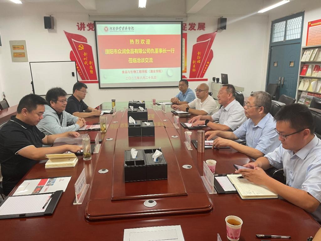 2023年8月29日,濮阳市众润食品有限公司董事长仇军携公司高层及中原工公司吴殿朝教授来公司考察交流,洽谈合作事宜。食品与生物工程公司党委书记赵安勇、经理邹建、副经理郭宏伟以及张振辉博士参加了座谈会,座谈会由赵安勇书记主持。