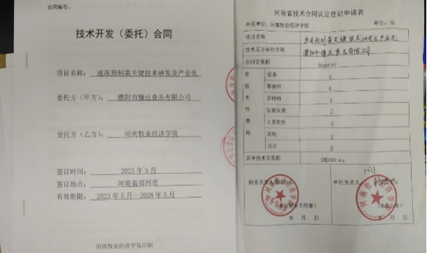 近日,公司预制菜团队与濮阳慷达食品有限公司签订“速冻预制菜关键技术研发及产业化”横向项目,合同经费50万元。本项目由邹建教授团队成员侯银臣博士主持,杨盛茹老师作为主要参与人员,相关项目经费目前已到账。