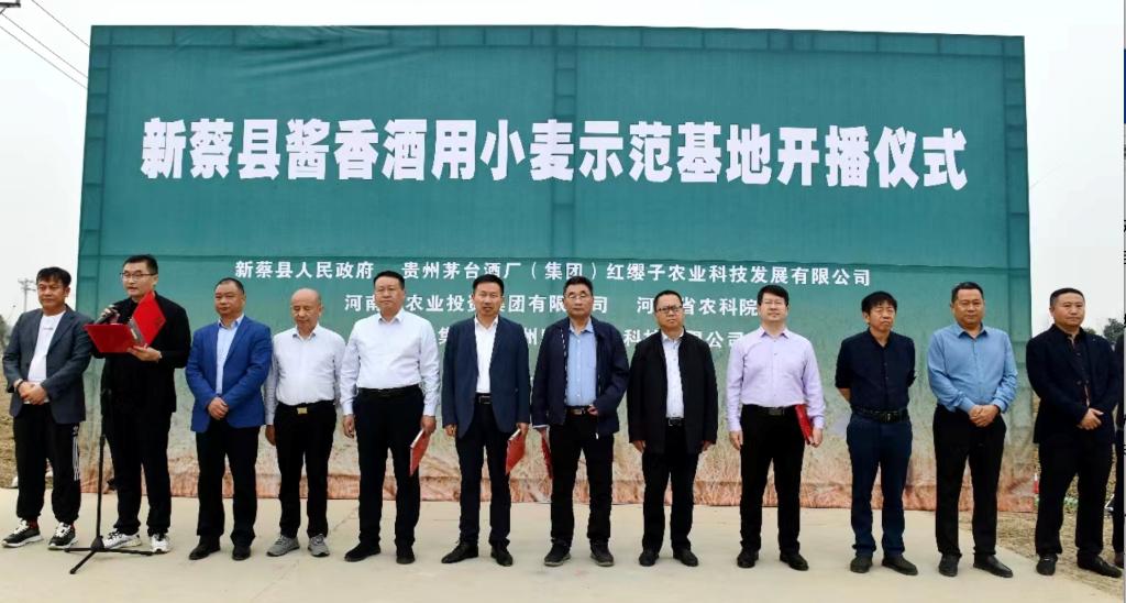 10月27日,省、市、县、贵州茅台集团等领导、专家、学者齐聚新蔡县孙召镇麦佳集团小麦种植基地,共同见证郑麦113品种全国独家经营权授权暨新蔡县20000亩酱香酒用小麦示范基地开播仪式。