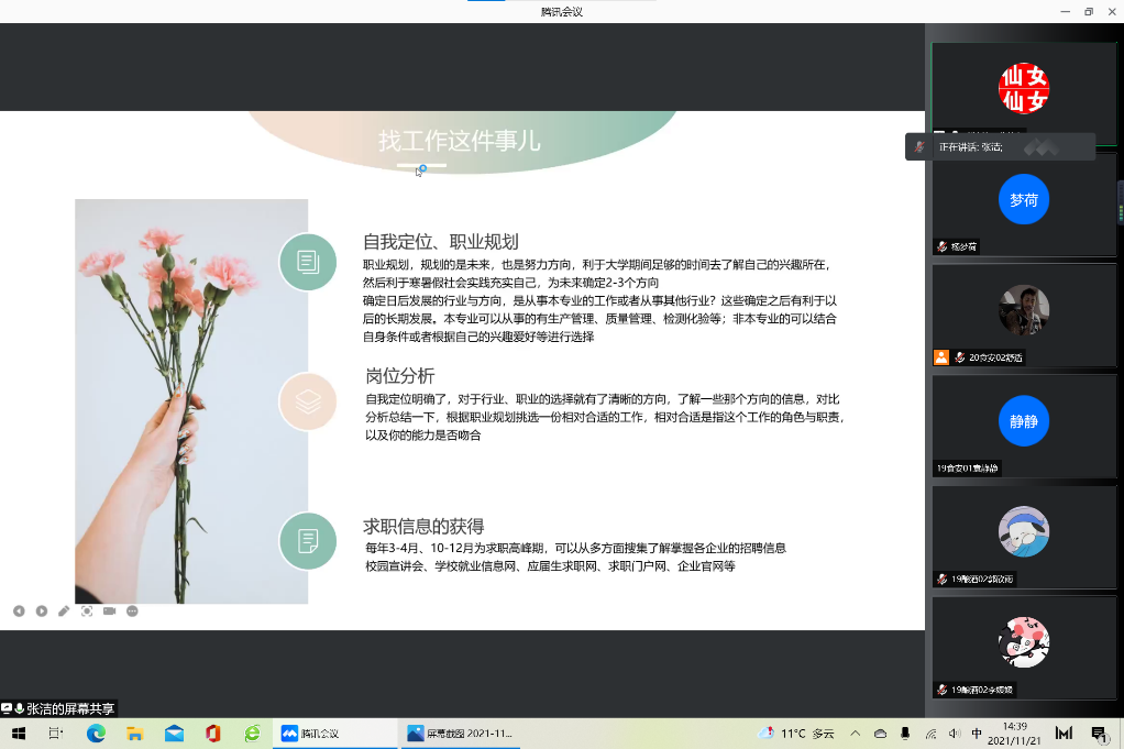 为帮助同学们树立良好的就业观念,指导同学们顺利走好就业之路。11月21日下午,best365足球官网创业实践服务中心举办的明理讲坛第七期在腾讯线上会议平台上如期举行,本次会议邀请了2021届优秀毕业生代表刘瑛瑛、张石、王韶梁、张洁同学为公司大三、大四的员工分享求职路上的心得与体会。