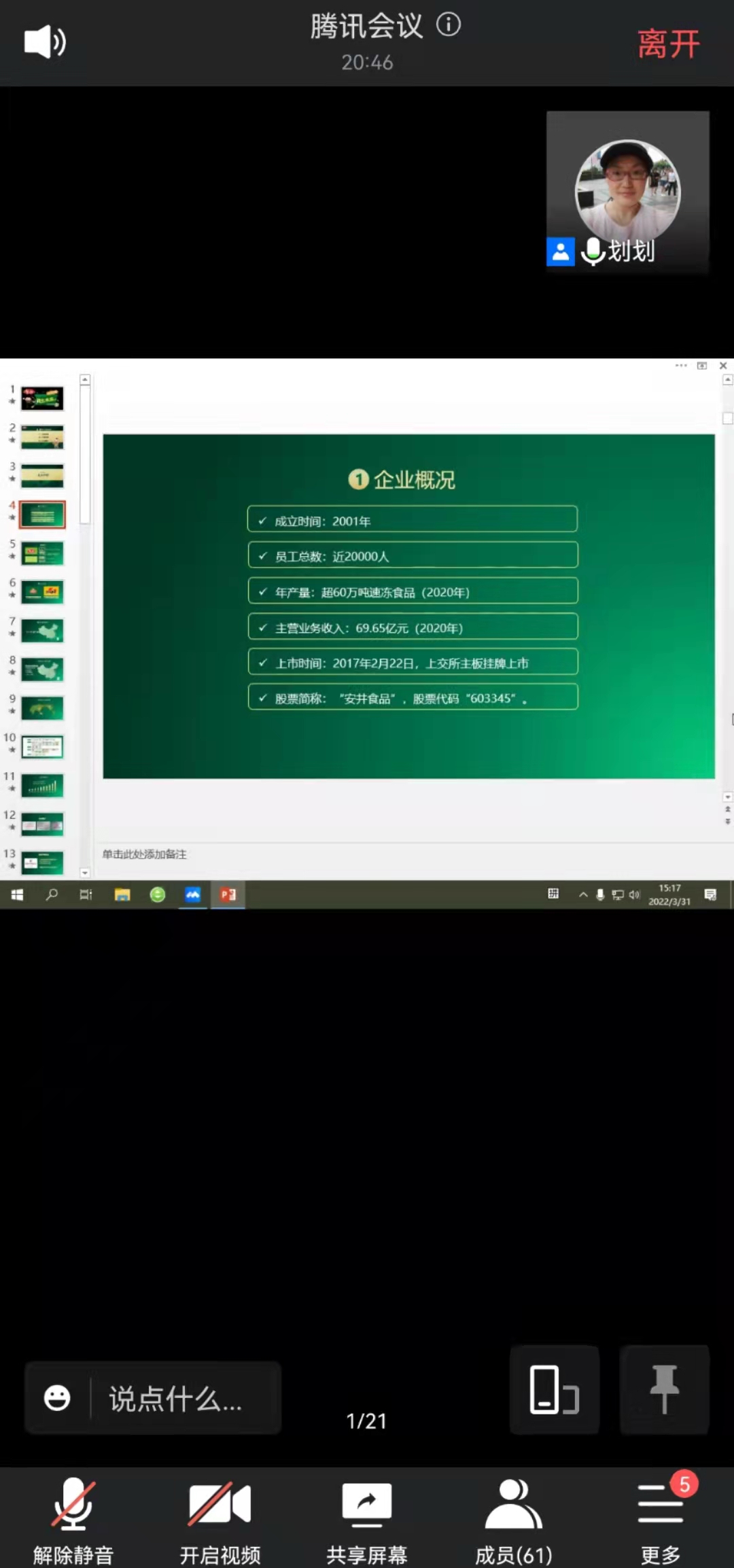 为切实做好2022届毕业生就业工作,积极搭建毕业生与用人单位的交流平台,拓宽毕业生就业渠道,公司于3月31日下午3点通过腾讯线上会议面向全院毕业生召开了泰州安井食品有限公司2022春招空中宣讲会。